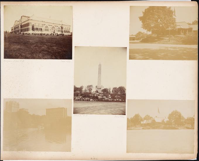 [Harbor, unidentified building from a park; shore of an unidentified lake.]