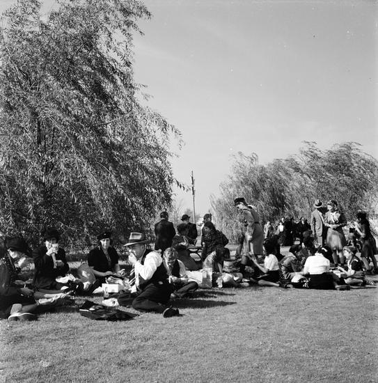 [Upside-down, reflected view of people at the New York World's Fair.]