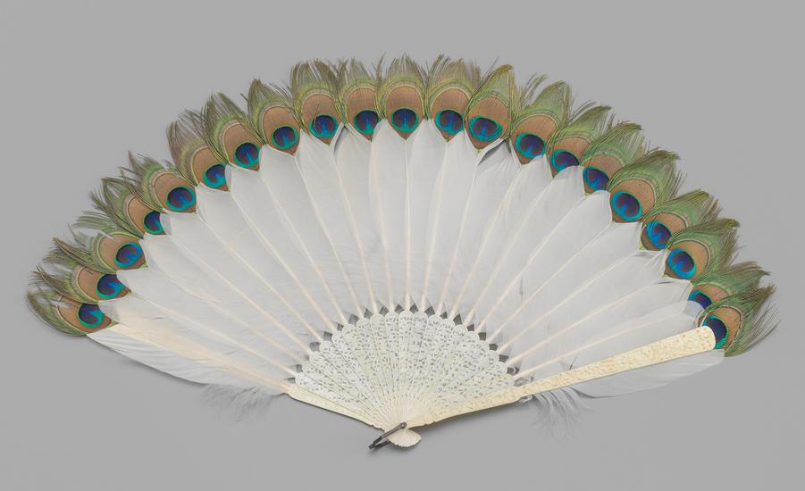 Folding feathered fan of yellow ostrich feathers tipped with birds' heads