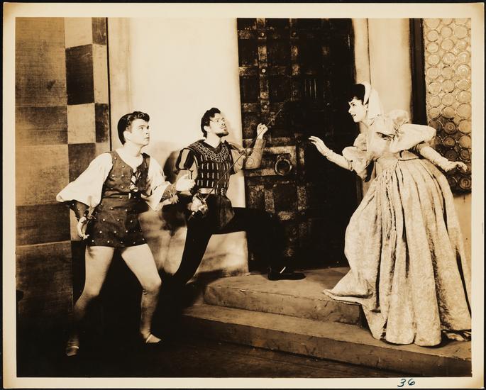[James Dobson as Ascanio, Gloria Story as Emelia and Paul Best as Marquis in "The Firebrand of Florence".]