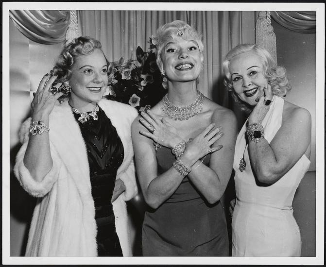 [Anita Alvarez as Gloria Stark, Carol Channing as Lorelei Lee, and Yvonne Adair as Dorothy Shaw in "Gentlemen Prefer Blondes".]