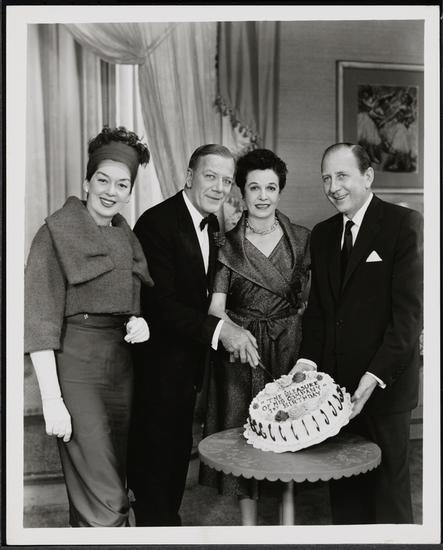 [Frederick Brisson, Katharine Hepburn, and Alan Jay Lerner at the first principals' rehearsal.]