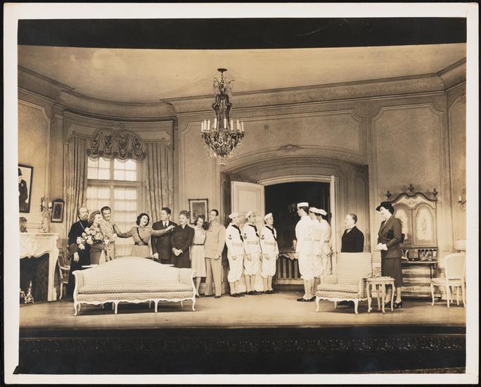 [Vinton Hayworth as Tom Dillon and Doris Nolan as Nan with members of the ensemble in "The Doughgirls".]