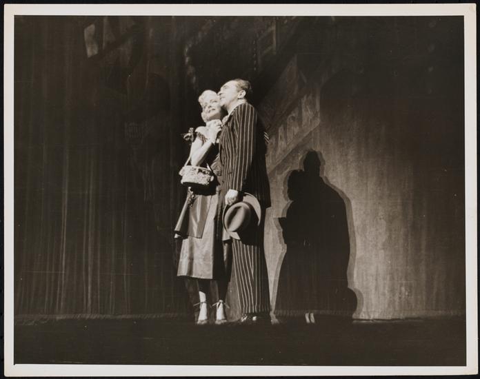 [Sam Levene as Nathan Detroit and Vivian Blaine as Miss Adelaide in "Guys and Dolls".]