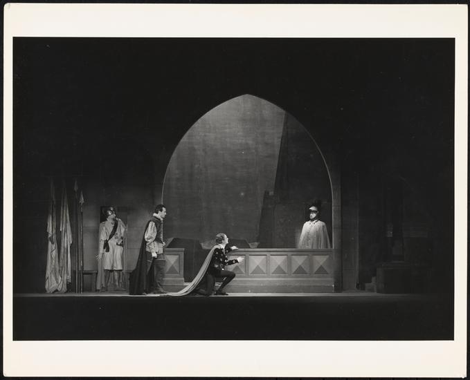 [Maurice Evans in the title role with an unidentified actress in "Hamlet".]