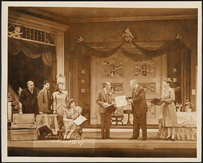 [Gene Lockhart as Rev. Homer Whatcoat, Margaret Hayes as Rita Collins, and Warren Douglas as Alec Dixon in "Happily Ever After".]