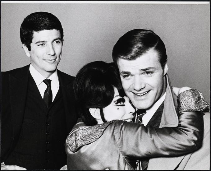 [Bert Convy as Clifford Bradshaw, George Reinholt as Ernst Ludwig, and Jill Haworth as Sally Bowles in "Cabaret".]