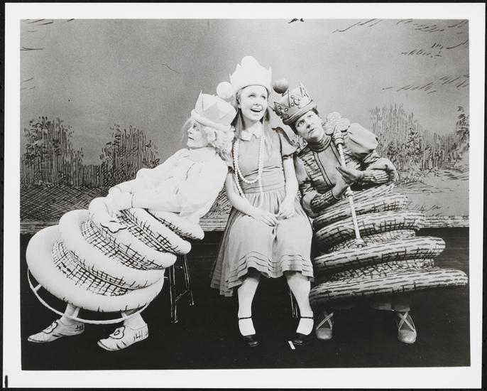 [Robert Ott Boyle as Tweedledum, John Remme as Tweedledee, and Kate Burton as Alice in "Alice in Wonderland".]