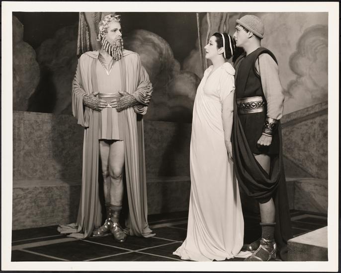[Albert Lunt as Jupiter, Richard Whorf as Mercury, and Lynn Fontanne as Alkmena in "Amphitryon 38".]