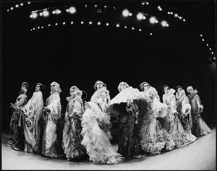 [George Hearn as Albin with Les Cagelles in "La Cage aux Folles".]