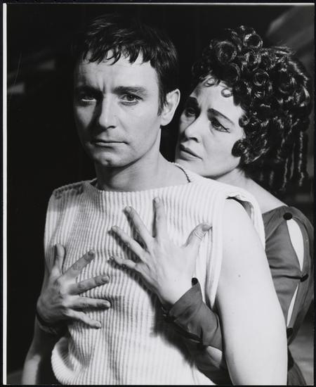 [Colleen Dewhurst as Caesonia and Philip Bourneuf as Cherae in "Caligula".]