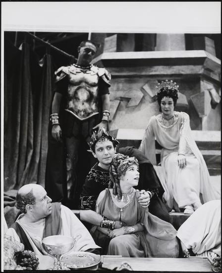 [Philip Bourneuf as Cherae, Kenneth Haigh as Caligula, Colleen Dewhurst as Caesonia, and Edward Binns as Helicon in "Caligula".]