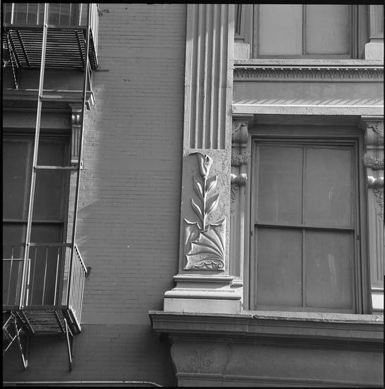 [Stone elves on unidentified corner building façade between stone base and upper section of brick.]