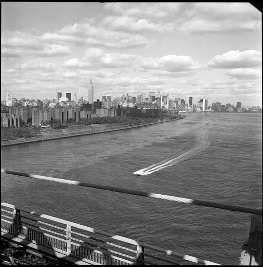 [Looking southwest from the Williamsburg Bridge to the Lower Manhattan skyline.]