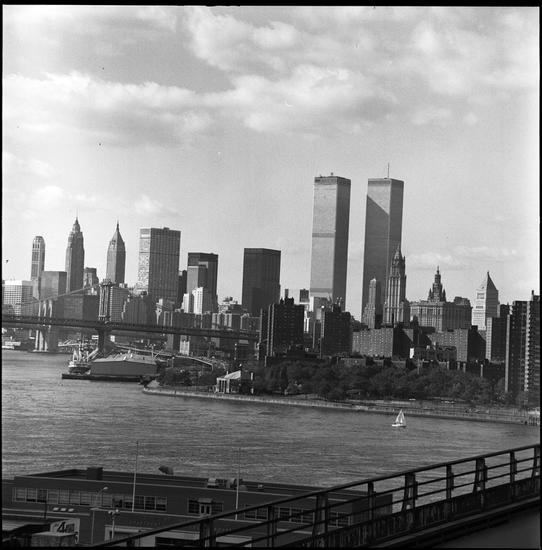 [Looking southwest across the East River to the Brooklyn Bridge and the twin towers of the World Trade Center.]