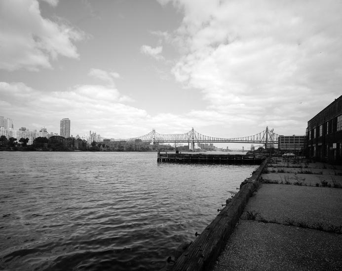 [Looking north on Roosevelt Island to the Welfare Island Bridge and Queens.]