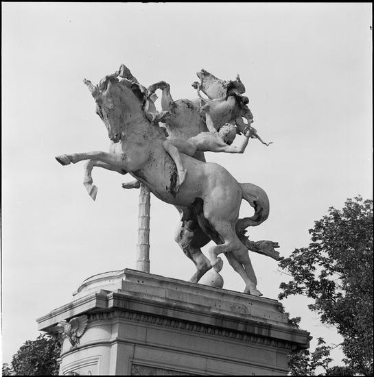 ["The Army: Genius of Patriotism Urging American Soldiers On To Victory" group on the south pedestal of the Soldiers' and Sailors' Memorial Arch.]
