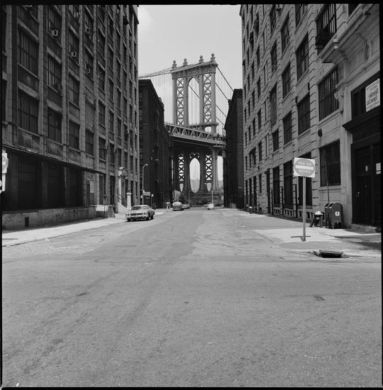 [Looking north from beneath the Watchtower Bible and Tract Society walkway to the Brooklyn Bridge.]