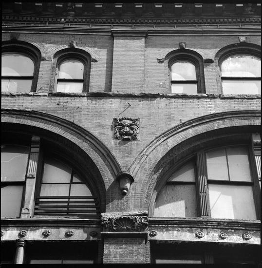 [Stone elves on unidentified corner building façade between stone base and upper section of brick.]