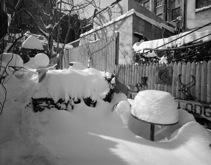 [Dog in the snow-covered backyard of 208 East 35th Street.]