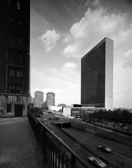 [View looking northeast from East 41st Street to the United Nations Headquarters.]
