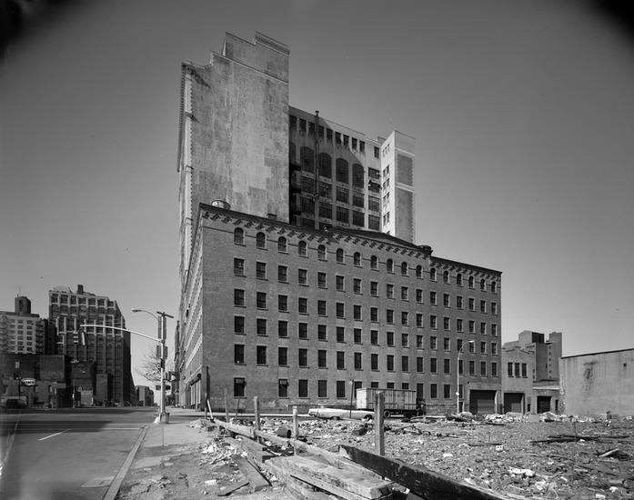 [Unidentified brick building next to rubble-strewn vacant lot.]