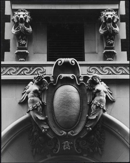 [Decorative owl sculpture on the façade of an unidentified building.]
