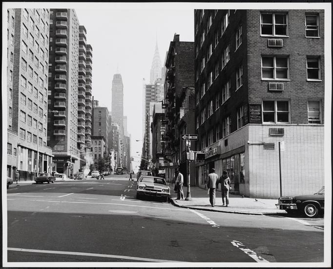 [Looking north toward the towers of the Waldorf-Astoria from 525 Lexington Avenue.]