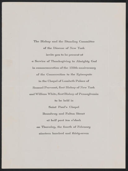 Invitation and admission ticket to Edward Etienne De Lancey to attend service at St. Paul's Chapel, April 30, 1889