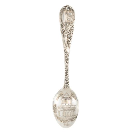 Souvenir spoon with image of Grant's Tomb in bowl and Brooklyn Bridge at handle end surrounded by floral and swirl motif. Inscription: On handle obverse: BROOKLYN BRIDGE / NEW YORK. On bowl obverse in raised lettering: GRANTS TOMB / RIVERSIDE PARK / N.Y. Mark: Marked on handle reverse: [Campbell-Metcalf Silver Co. trademark] 925 STERLING 1000.
