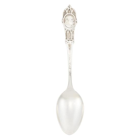 Souvenir spoon with plain bowl. Handle inscribed Brooklyn New York in relief with profile portrait of man's head and stained glass window motif. Inscription: Inscribed on handle: Brooklyn New York. Mark: Marked on handle reverse: [maker's mark] STERLING.