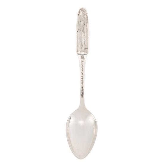 Souvenir spoon with image of Rockefeller Center on handle end obverse above plain egg-shaped bowl. Inscription: On handle obverse in raised lettering: ROCKFELLER CENTER. On handle reverse in raised lettering: RADIO CITY. Mark: Marked on handle reverse: [crown] [Gothic W] [lion passant] STERLING.