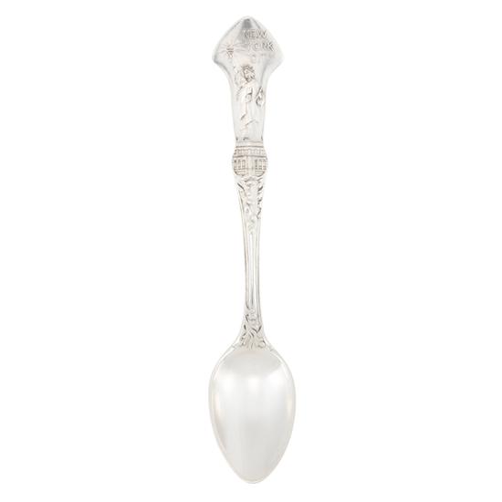 Souvenir spoon with partial seal of the City of New York and leaf motif on handle reverse continuing to handle obverse below image of the Statue of Liberty at hanlde tip. Inscription: On handle obverse at tip: NEW / YORK / CITY. Mark: Marked on handle reverse: TIFFANY & CO. STERLING