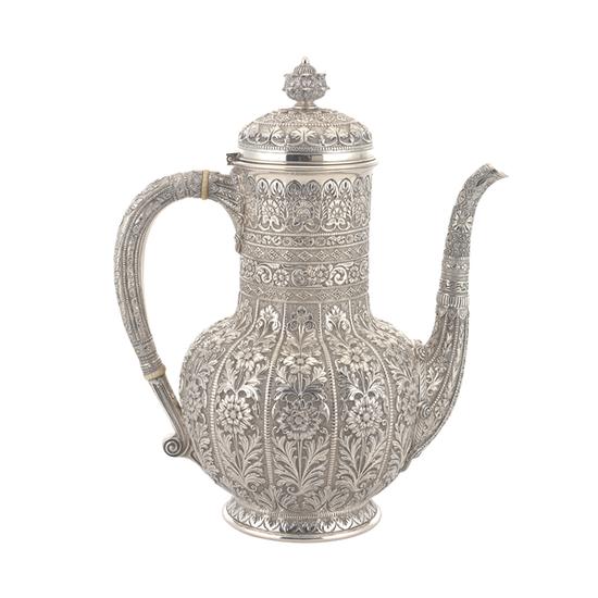 Coffee Pot part of five-piece coffee and tea service decorated in the "Tarmarind" pattern, with spun bodies of globular form on outwardly flaring molded circular feet, loop handles and spout attached to body with chased peacock feathers, domed covers with finials, bodies and covers deeply repoussé-chased with bands of sunflowers and leaves. Engraved in script on the underside of the base: HK. Incuse, struck on base: TIFFANY & CO. / 3650 MAKERS 8920 / STERLING-SILVER / 925-1000 / M.