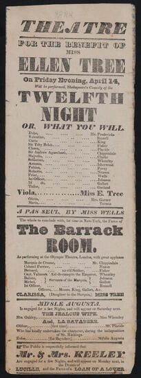 Wednesday evening, November 2, will be played Shakespeare's comedy in five acts, of "Twelfth Night; or, What You Will"