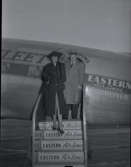 Paper dress with black-and-white images of Governor Nelson Rockefeller on blue and yellow striped ground