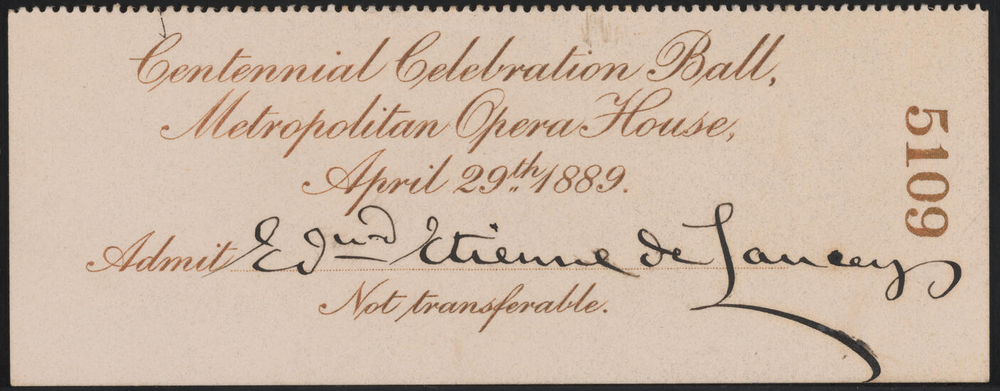 Admission ticket to Edward Floyd De Lancey to attend centennial celebration ball, April 29, 1889