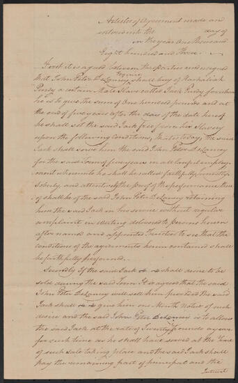 Agreement issued by Peter Underhill to John Peter De Lancey for the terms and conditions of the manumission of a slave, May 14, 1807