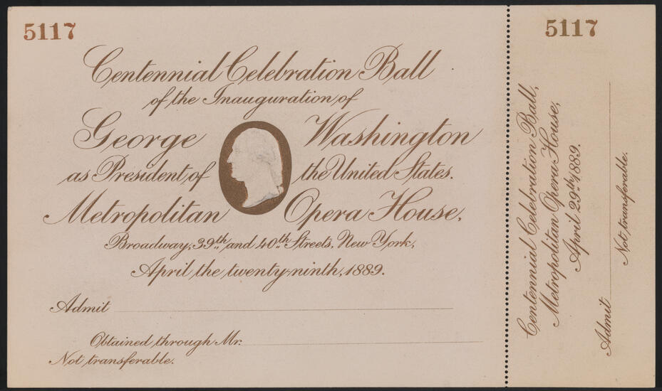 Admission ticket to Edward Etienne De Lancey to attend centennial celebration ball, April 29, 1889