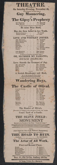 Friday, October 16, 1857, the celebrated musical drama "Guy Mannering; or, The Gipsy's Prophecy" with Miss Cushman as Meg Merrilies