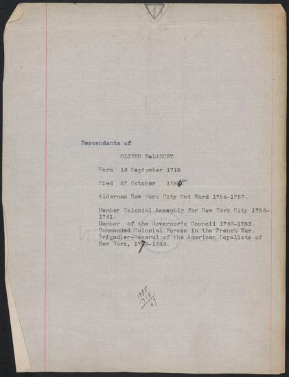 Undated De Lancey family genealogy compiled by William H. De Lancey