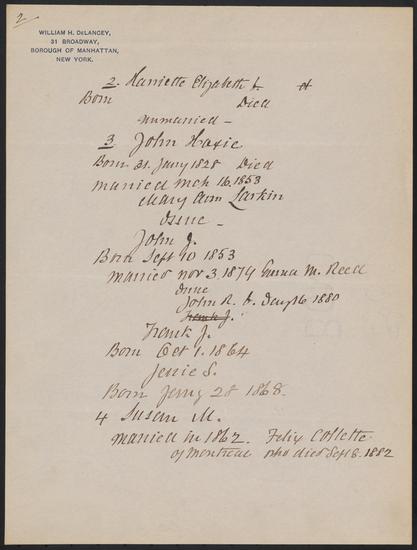 Undated De Lancey family genealogy compiled by William H. De Lancey