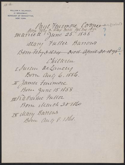 Undated De Lancey family genealogy compiled by William H. De Lancey