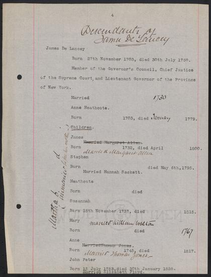 Undated De Lancey family genealogy compiled by William H. De Lancey