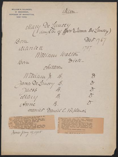 Undated De Lancey family genealogy compiled by William H. De Lancey