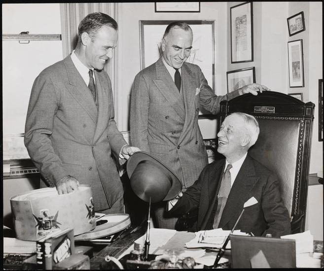 [Al Smith with Hebert Hoover and another man at an automobile show.]