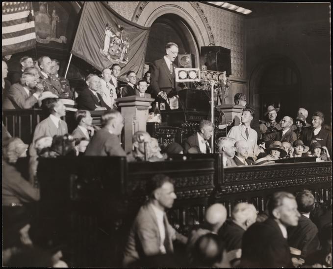 [Al Smith giving his speech of acceptance of the presidential nomination.]