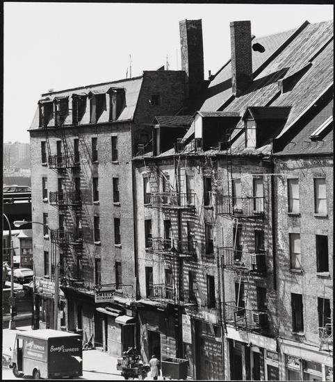 [Aerial view of the rooftops of Schermerhorn Row.]