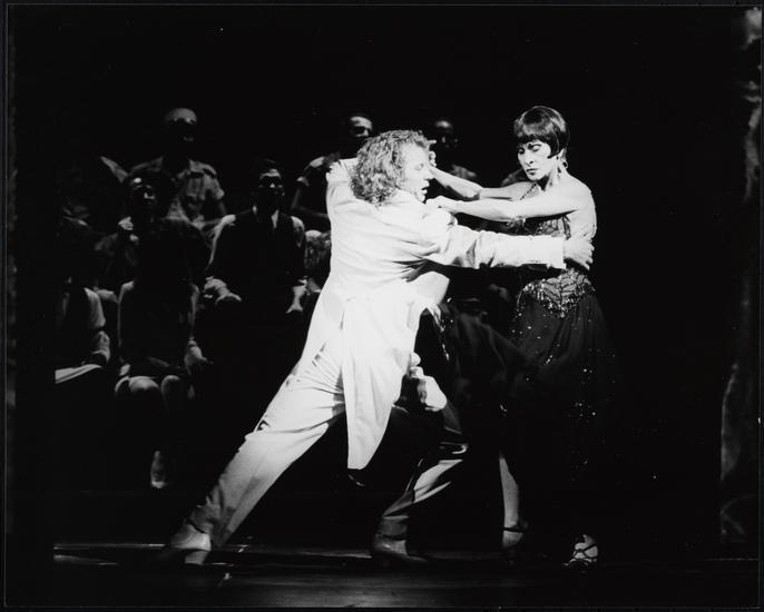 [Chita Rivera as the Spider Woman/Aurora and Brent Carver as Molina in "Kiss of the Spider Woman".]
