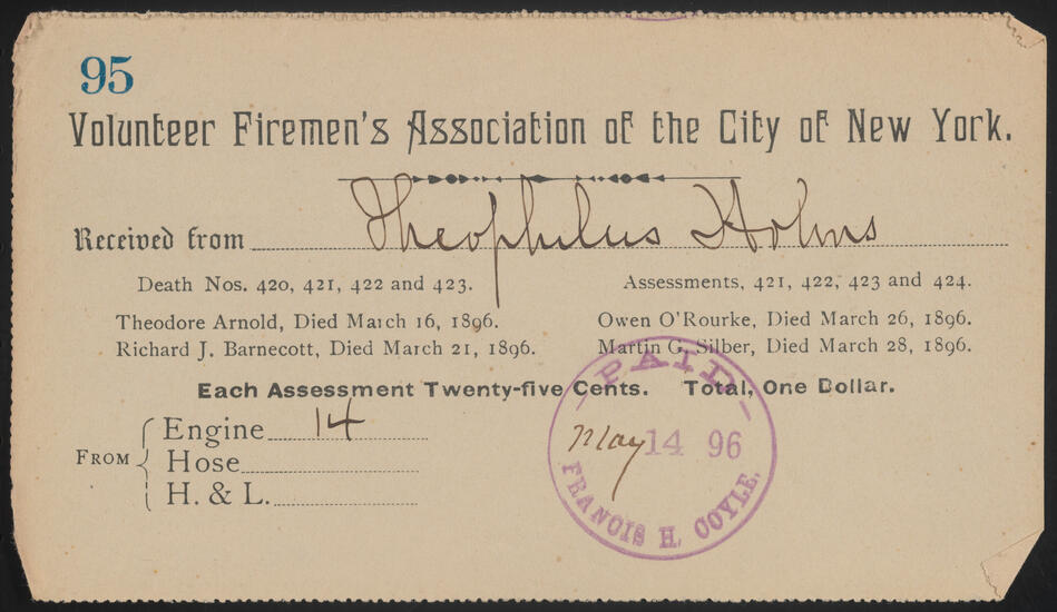 [Notice of deaths and assessments of the Volunteer Firemen's Association.]